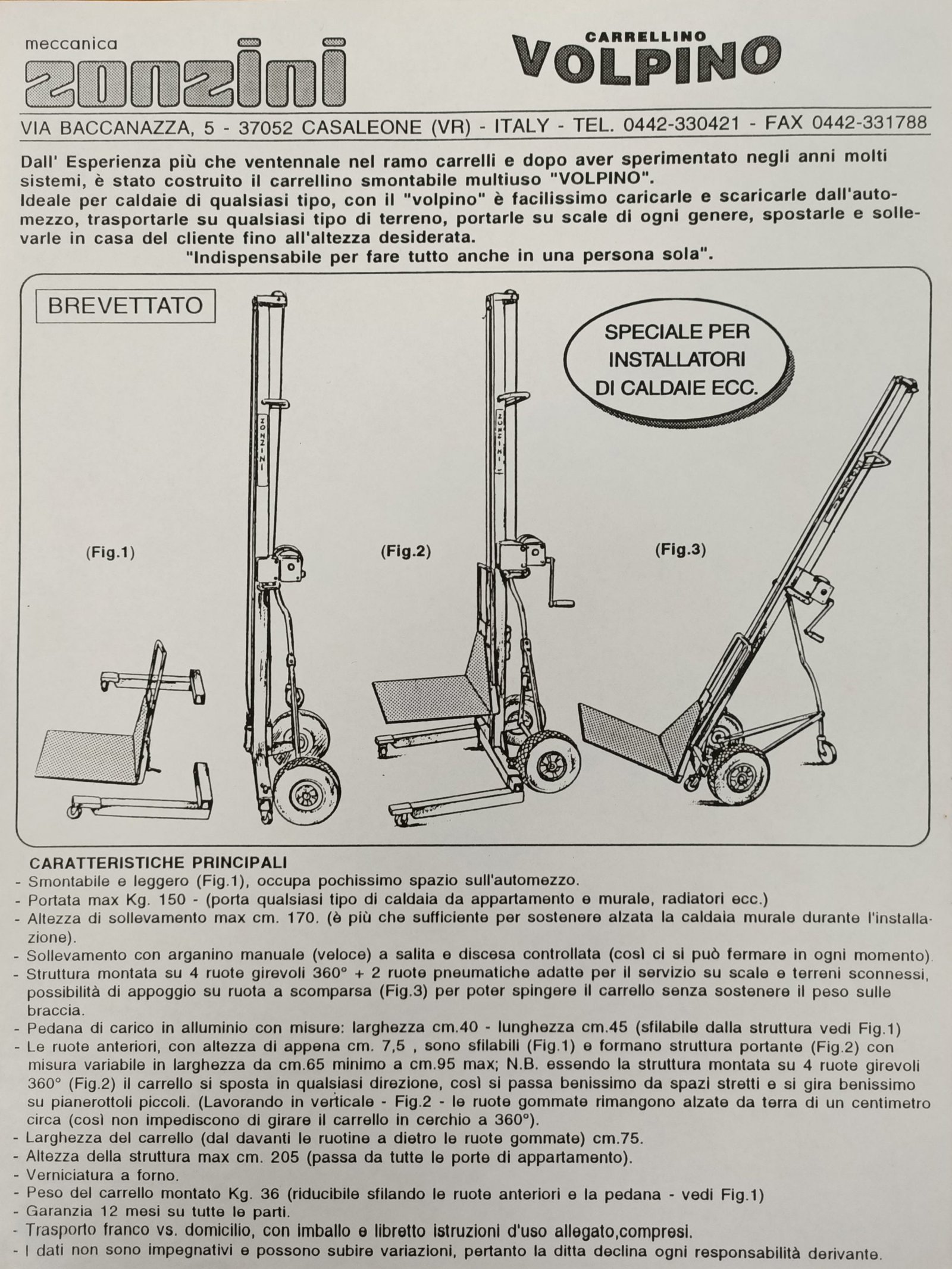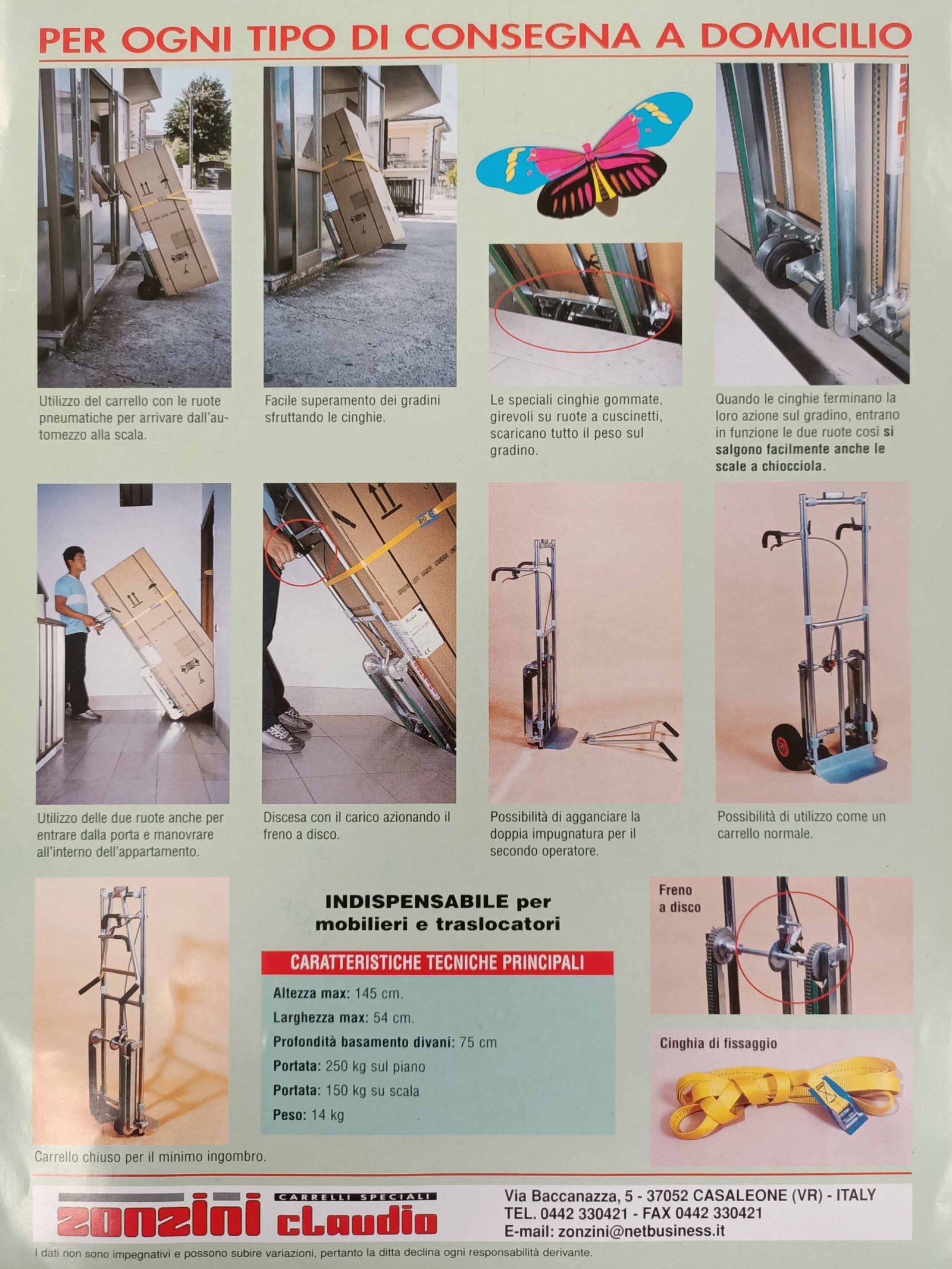 En 1988, Zonzini hizo historia con la introducción de la primera carretilla sube escaleras eléctrica para el transporte de muebles, electrodomésticos y encimeras de cocina. Este modelo, denominado “Artiglio”, se destacó por su tecnología innovadora para subir y bajar escaleras. Utilizaba una serie de ganchos (o "artigli", por la forma que tenían) que se enganchaban en el peldaño superior y arrastraban el dispositivo y la carga hacia arriba. Esta fue la primera carretilla sube escaleras eléctrica de su tipo, inspirando a muchas otras empresas a desarrollar productos similares.