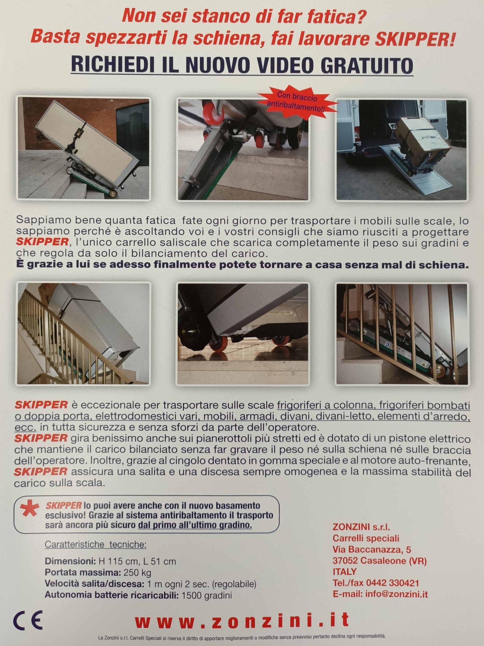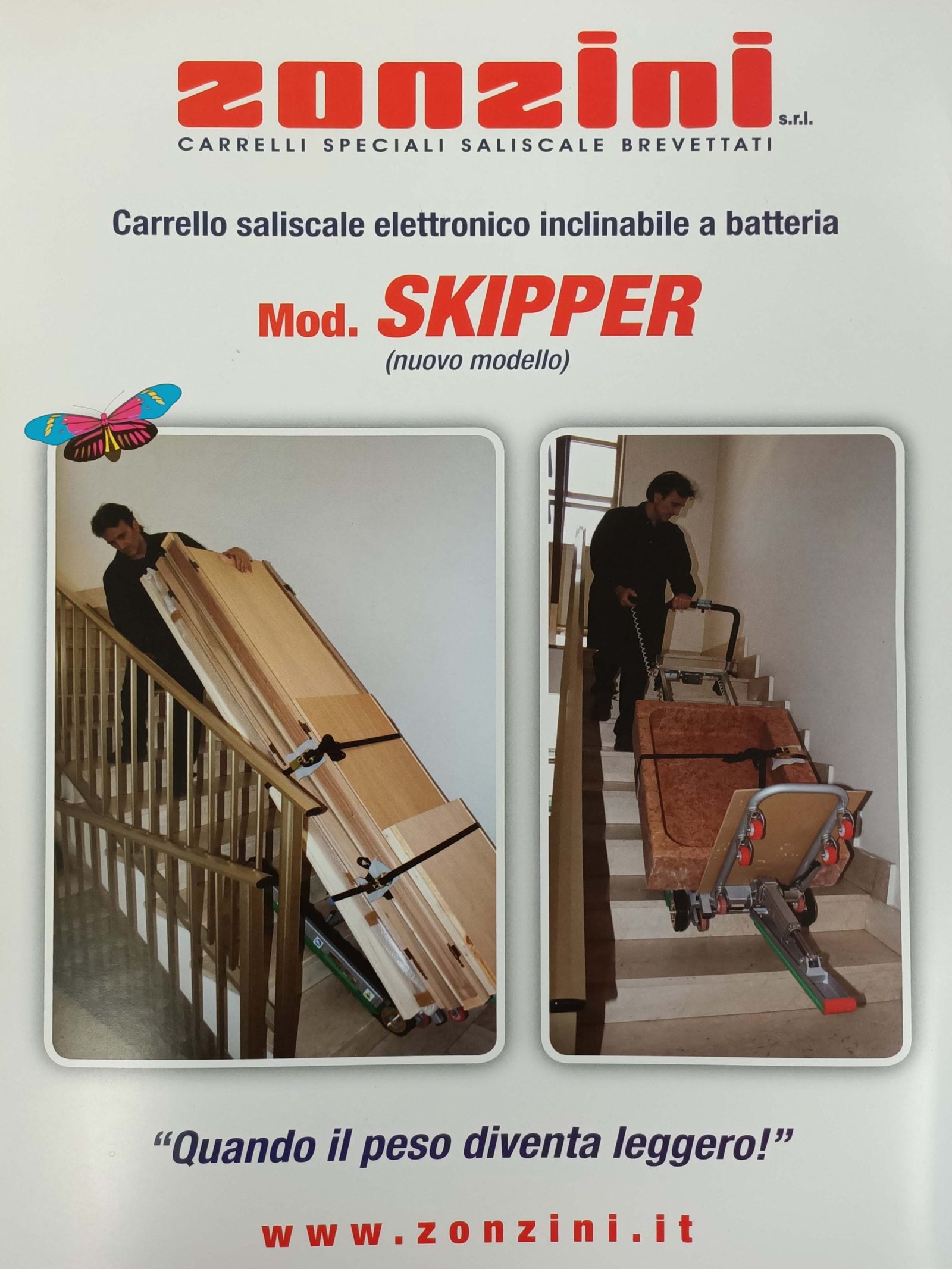 En 2003 nació una de las carretillas sube escadas más seguras y fiables jamás construidas, el modelo Skipper con base antirvolcamiento. Fue una sube escaleras única y lo ha sido durante muchos años después. Se convirtió en un gran clásico. Durante años, la carretilla sube escadas con orugas modelo Skipper fue considerada la más segura jamás construida porque utilizaba lo que se conocería como los orugas Zonzini, de calidad y fiabilidad incomparables. Muchas empresas la han utilizado, y aún la utilizan, para transportar máquinas expendedoras, calderas, bloques de mármol y material pesado de todo tipo.