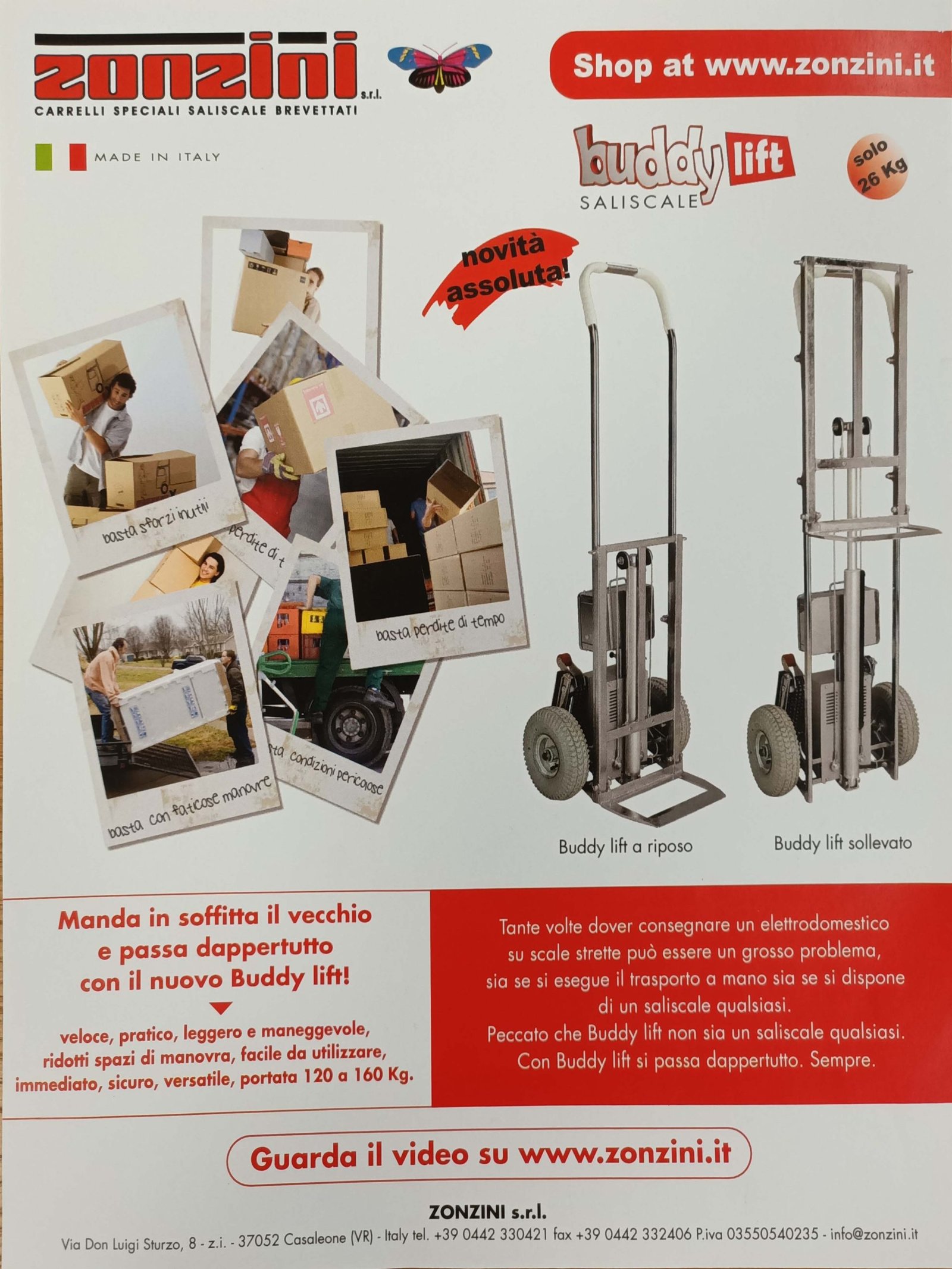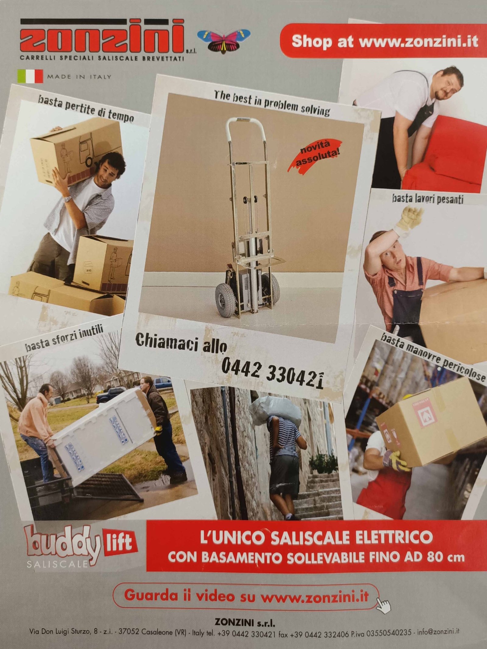En esos años, Zonzini estaba ganando rápidamente cuota de mercado en el sector de las carretillas sube escadas con orugas para el transporte pesado, por lo que era necesario diversificarse para conquistar mercados en los que la marca Zonzini era menos conocida. Se introdujeron entonces las carretillas sube escadas eléctricas modelos Buddy y Buddy Lift, adecuadas para el transporte de cargas más ligeras y menos exigentes, como los electrodomésticos, por ejemplo. El Buddy Lift, en particular, fue muy apreciado por el público debido al elevador eléctrico integrado de la carga, que permitía mejorar el centro de gravedad durante el transporte por las escaleras. Este tipo de tecnología, de hecho, es menos avanzada que las orugas y todavía depende en gran medida de la capacidad del operador para gestionar el equilibrio de la carga en cada peldaño, razón por la cual son adecuadas solo para el transporte de cargas más ligeras y menos voluminosas en comparación con las carretillas con orugas.